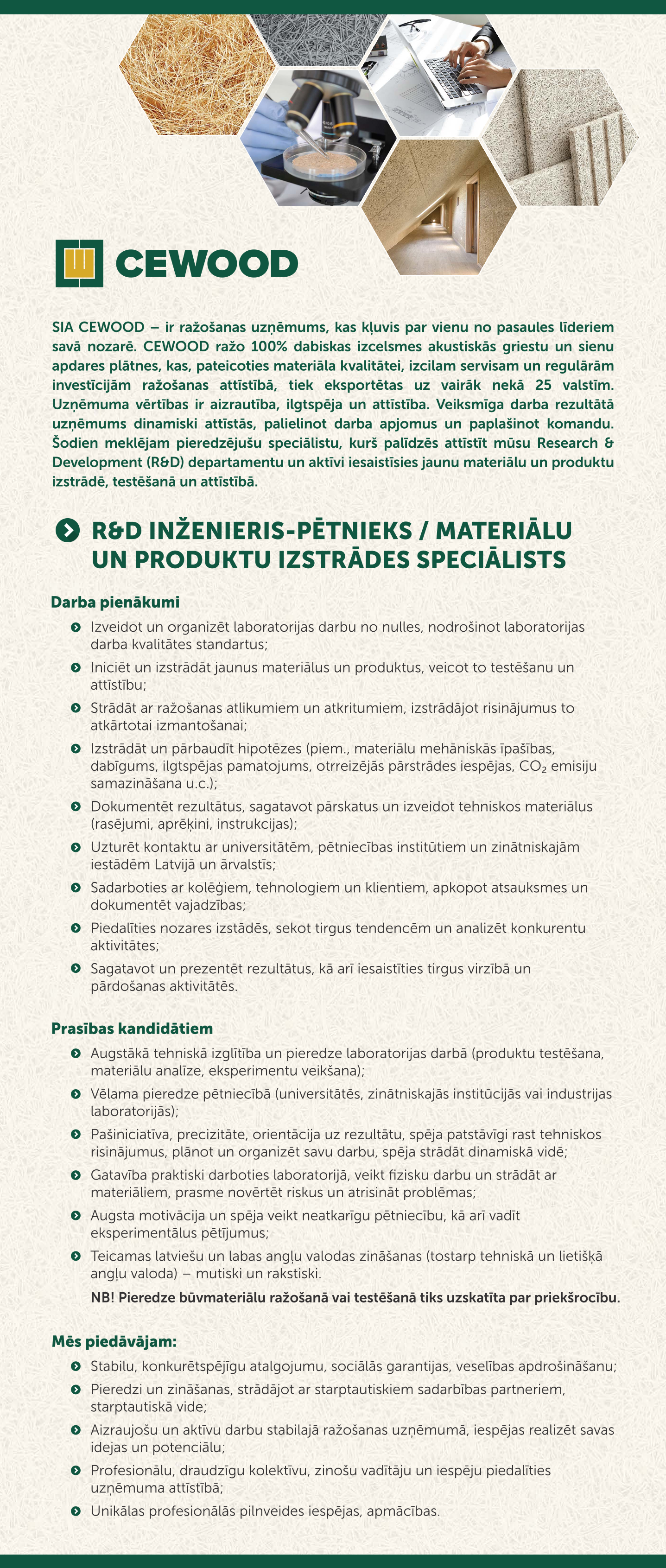 SIA CEWOOD - ir ražošanas uzņēmums, kas kļuvis par vienu no pasaules līderiem savā nozarē. CEWOOD ražo 100% dabiskas izcelsmes akustiskās griestu un sienu apdares plātnes, kas, pateicoties materiāla kvalitātei, izcilam servisam un regulārām investīcijām ražošanas attīstībā, tiek eksportētas uz vairāk nekā 25 valstīm. Uzņēmuma vērtības ir aizrautība, ilgtspēja un attīstība. Veiksmīga darba rezultātā uzņēmums dinamiski attīstās, palielinot darba apjomus un paplašinot komandu.
