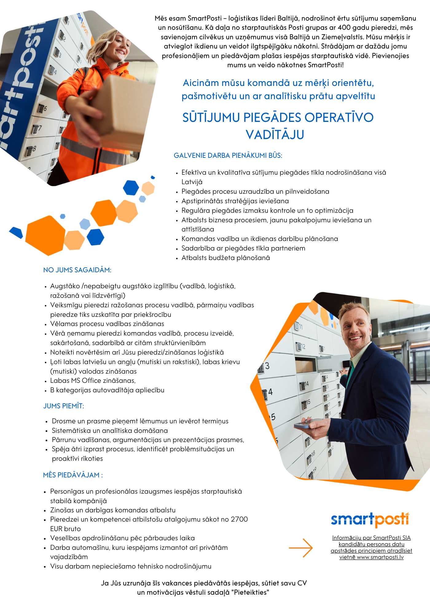 Mēs esam SmartPosti loģistikas līderi Baltijā, nodrošinot ērtu sūtījumu saņemšanu un nosūtīšanu. Kā daļa no starptautiskās Posti grupas ar 400 gadu pieredzi, mēs savienojam cilvēkus un uzņēmumus visā Baltijā un Ziemeļvalstīs. Mūsu mērķis ir atvieglot ikdienu un veidot ilgtspējīgāku nākotni. Strādājam ar dažādu jomu profesionāļiem un piedāvājam plašas iespējas starptautiskā vidē. Pievienojies mums un veido nākotnes SmartPosti!
