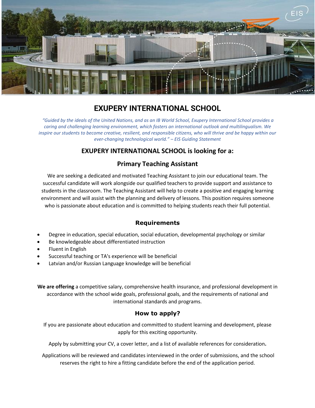 Exupery International School is a fully authorised International Baccalaureate (IB) school currently offering the Primary Years Programme (IB PYP) for preschool and primary pupils and also International Baccalaureate Diploma Programme (IB DP) in senior school, while the middle school focuses on preparing for the UK IGCSEs which take place in the 10th grade.