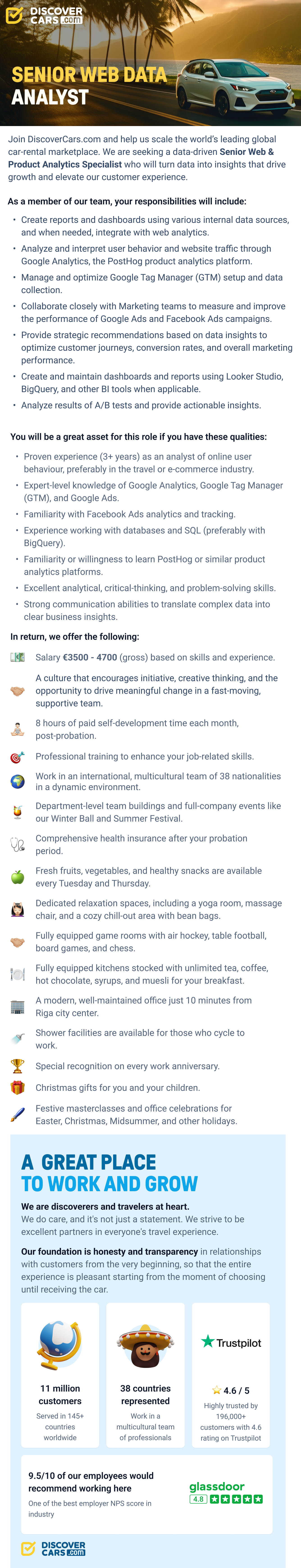 DiscoverCars.com, one of the fastest-growing companies in Europe, according to the Financial Times, seeks to be a world leader in online car rental reservations. Serving more than 10k locations in 145 countries, our company is constantly adding new partners in new locations and pushing for the best prices and service for our customers.