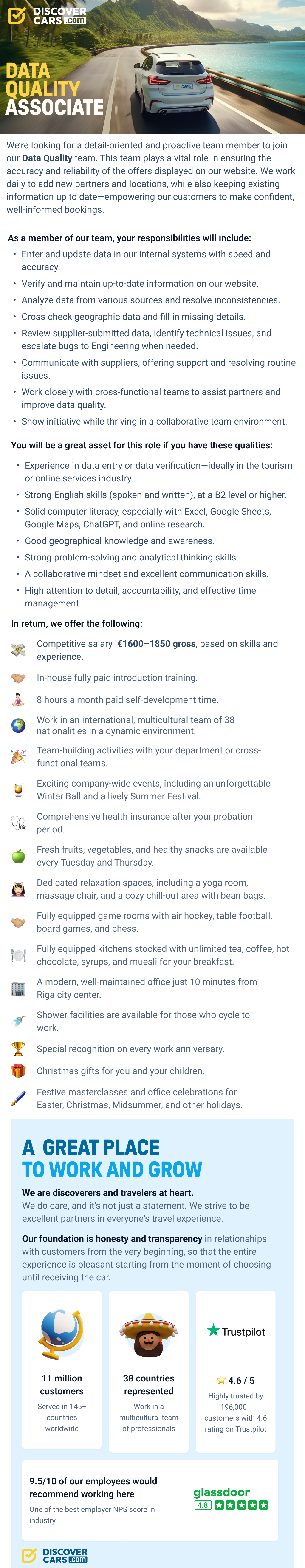 DiscoverCars.com, one of the fastest-growing companies in Europe, according to the Financial Times, seeks to be a world leader in online car rental reservations. Serving more than 10k locations in 145 countries, our company is constantly adding new partners in new locations and pushing for the best prices and service for our customers.