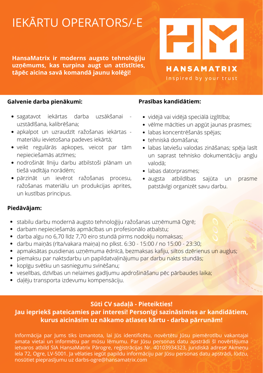 Papildu informācija: Ikmēneša atalgojums no 6,70 līdz 7,70 eiro stundā pirms nodokļu nomaksas; līdzfinansētasas pusdienas, bezmakas siltos dzērienus un augļus; veselības, dzīvības un nelaimes gadījumu apdrošināšanu u.c. labumi.
