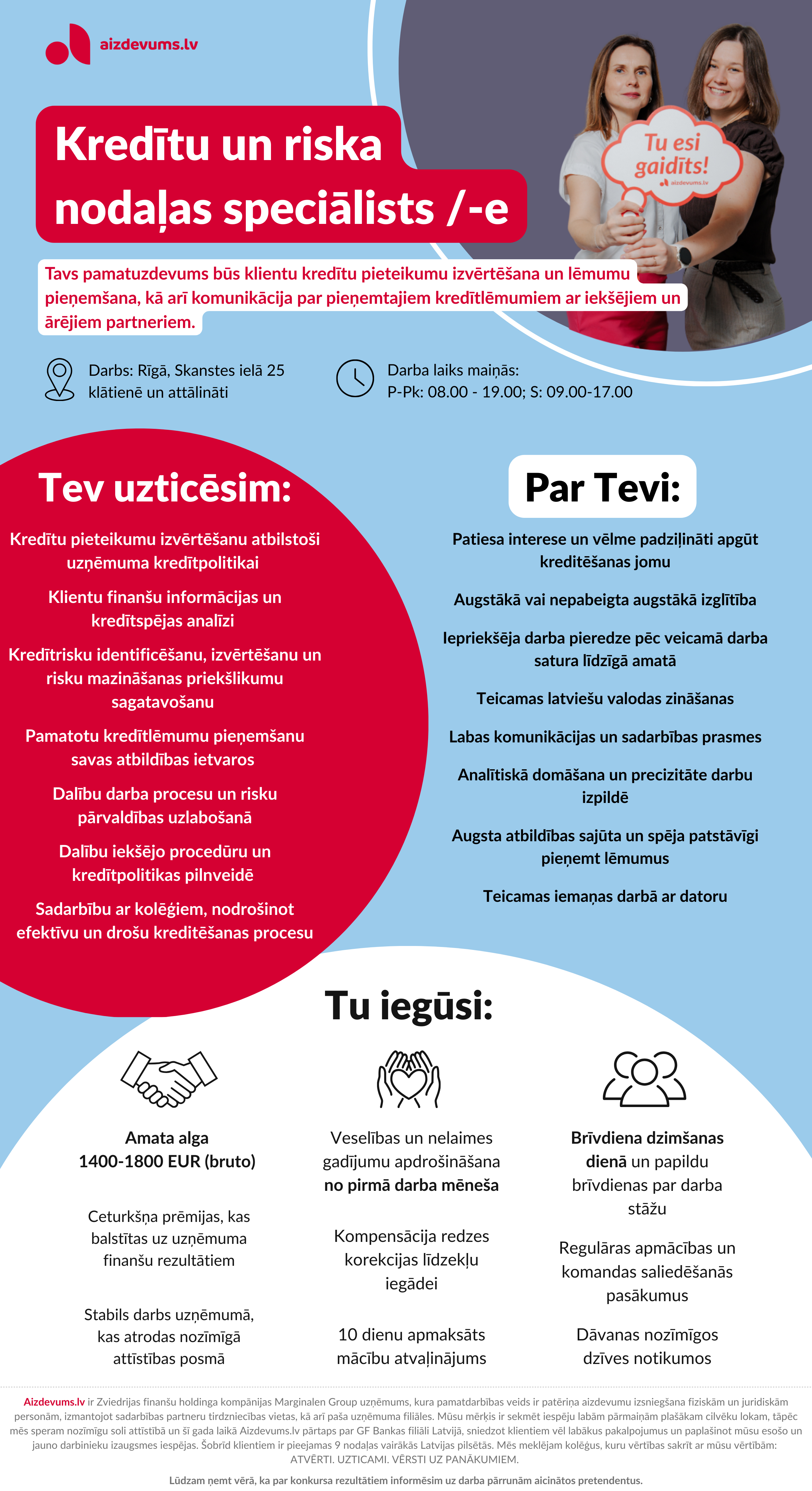 Lūdzam ievērot, ka par konkursa rezultātiem informēsim uz darba pārrunām uzaicinātos pretendentus. Gadījumā, ja divu nedēļu laikā pēc konkursa beigu termiņa neesat saņēmis uzaicinājumu uz darba interviju, ir uzskatāms, ka esat saņēmis Aizdevums.lv atteikumu.
