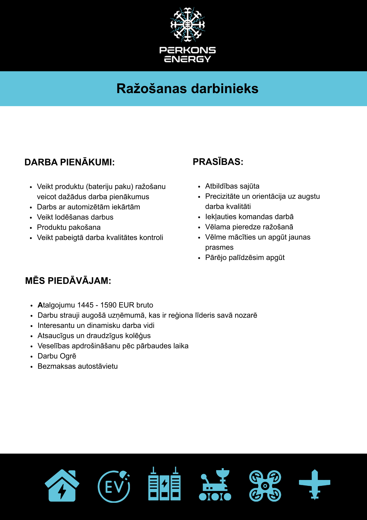 Mēs esam Latvijas uzņēmums, kas specializējies augstas veiktspējas bateriju paku ražošanā, kas piemērotas FPV, kravas, liela darbības rādiusa, lauksaimniecības un citiem droniem. Mūsu ražotās bateriju pakas tiek pielietotas arī citās jomās, kur ir svarīga veikstpējas/cenas attiecība.