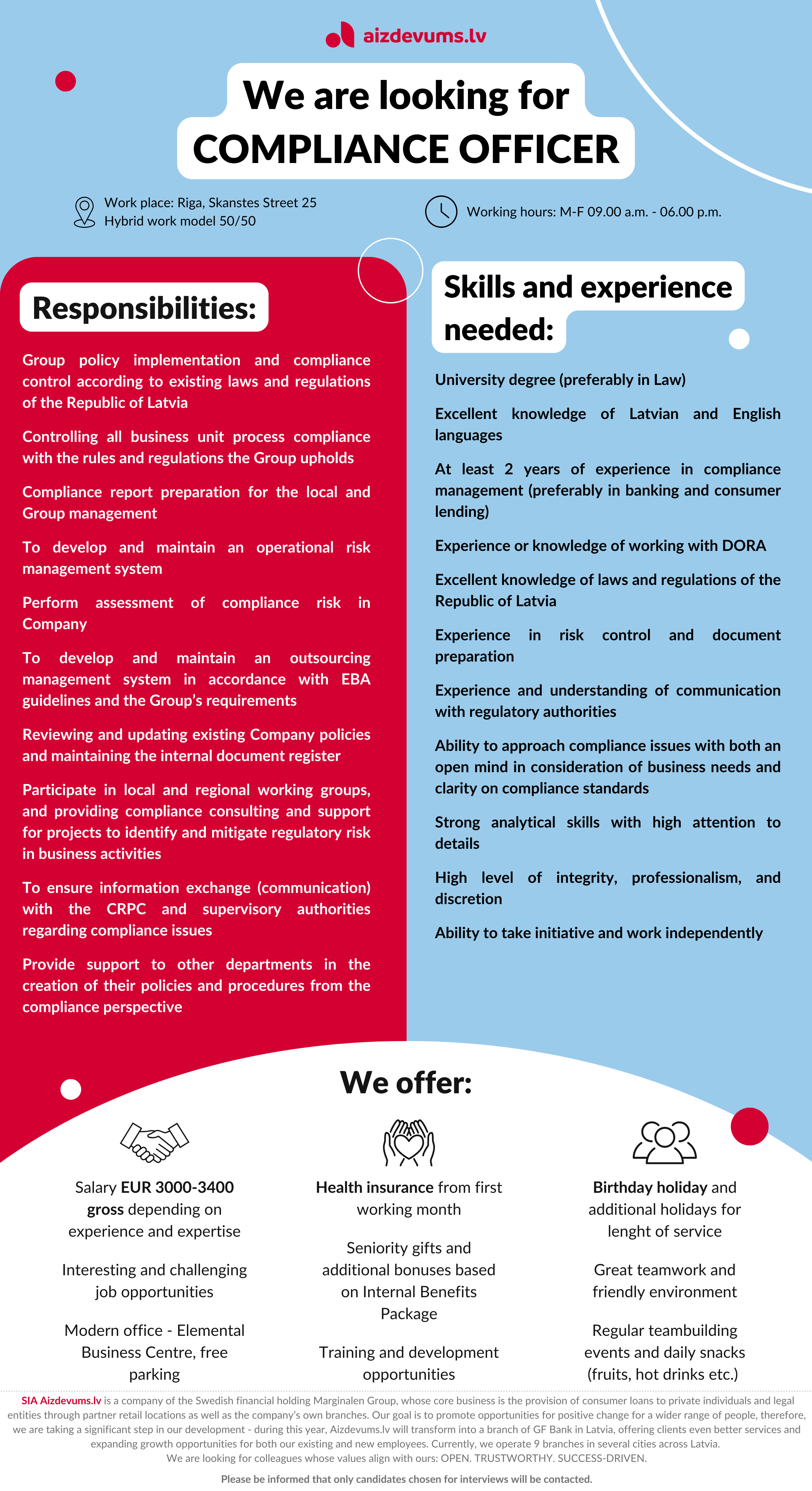 - Excellent knowledge of Latvian and English languages