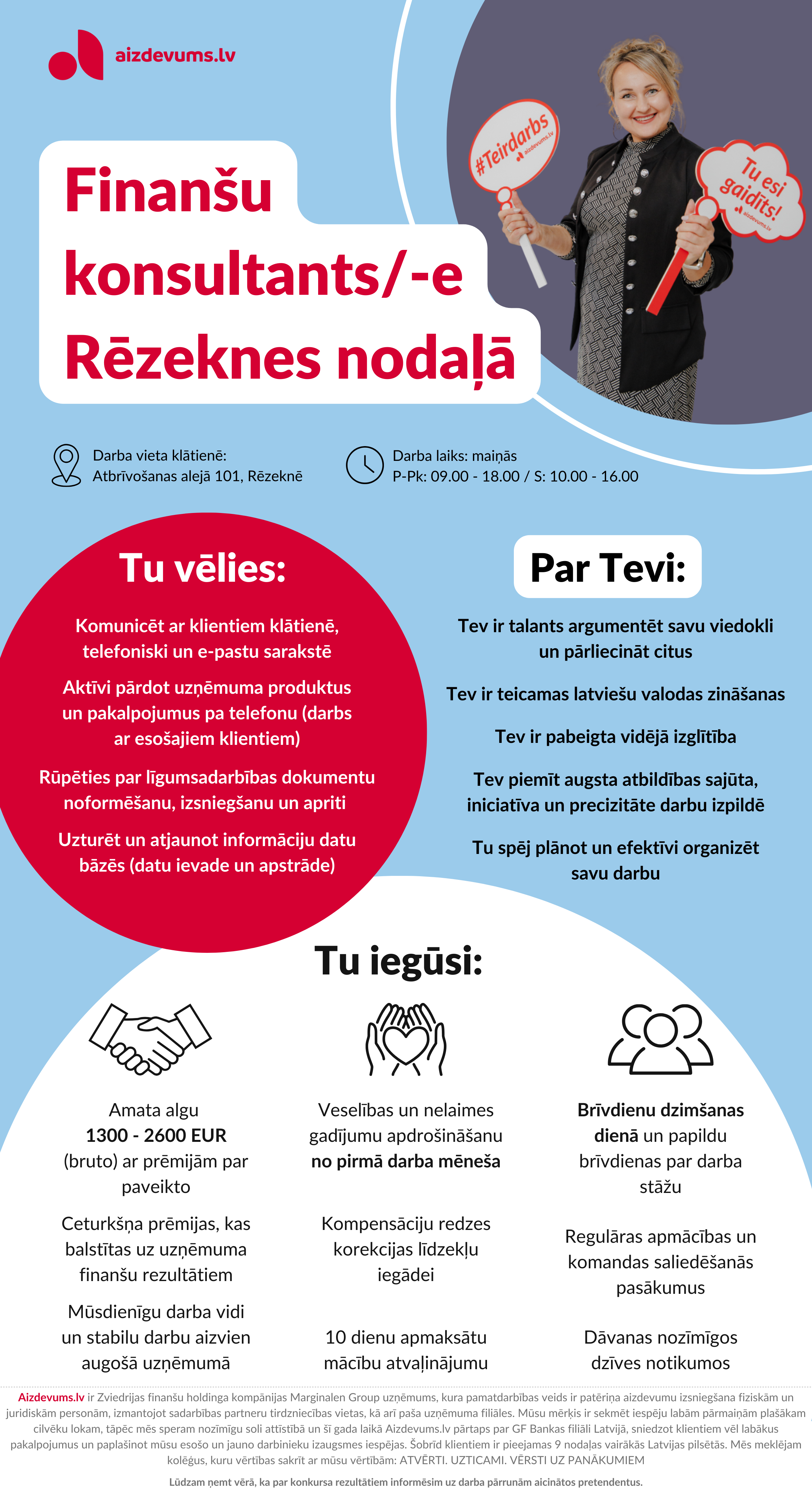 Lūdzam ievērot, ka par konkursa rezultātiem informēsim uz darba pārrunām uzaicinātos pretendentus. Gadījumā, ja divu nedēļu laikā pēc konkursa beigu termiņa neesat saņēmis uzaicinājumu uz darba interviju, ir uzskatāms, ka esat saņēmis Aizdevums.lv atteikumu.