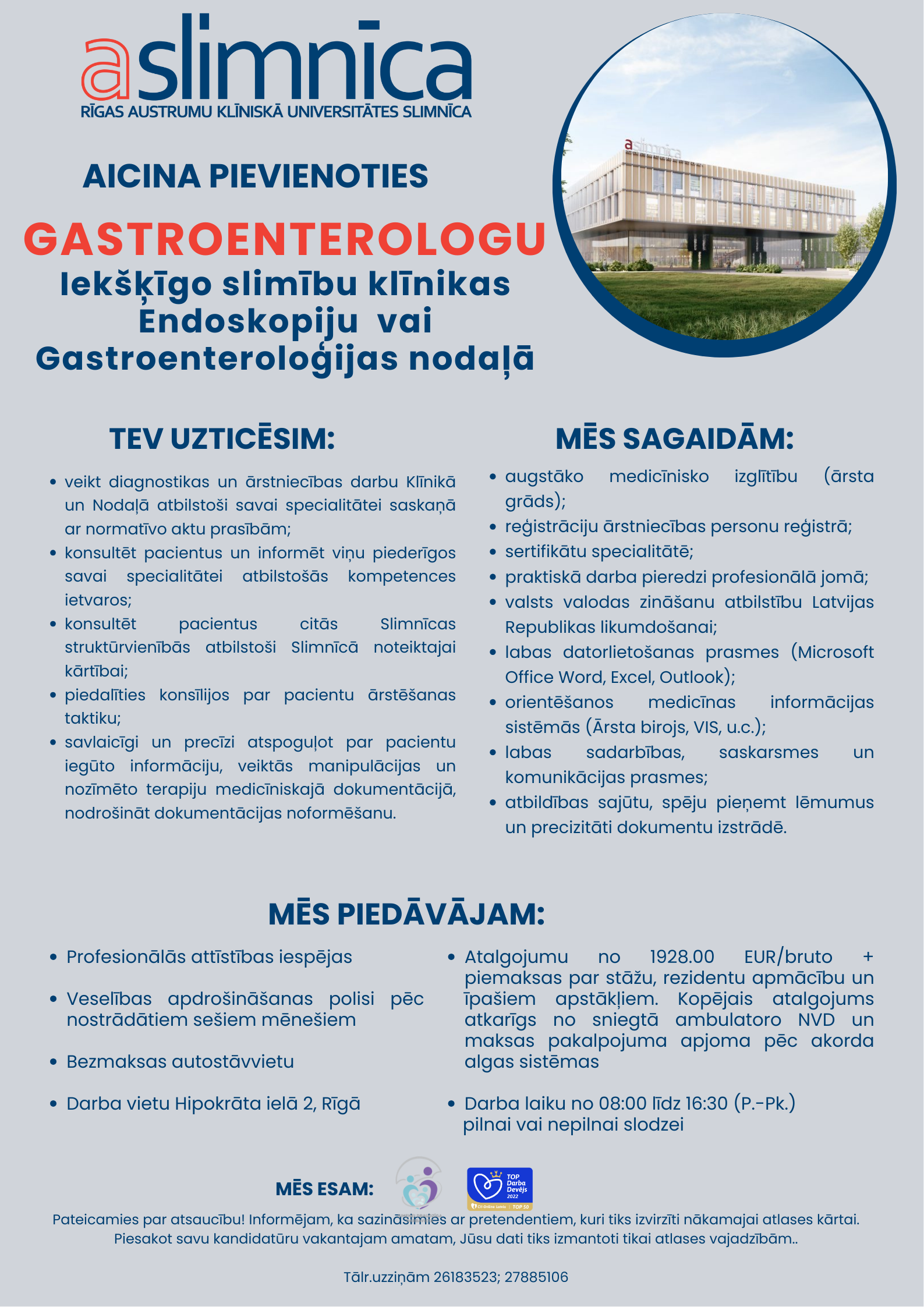 Aicinām pievienoties mūsu profesionāļu komandai, izvēloties sev atbilstošu vakanci kādā no slimnīcas stacionāriem un Jūs iegūsiet darbu vienā no Latvijas lielākajiem un stabilākajiem uzņēmumiem.