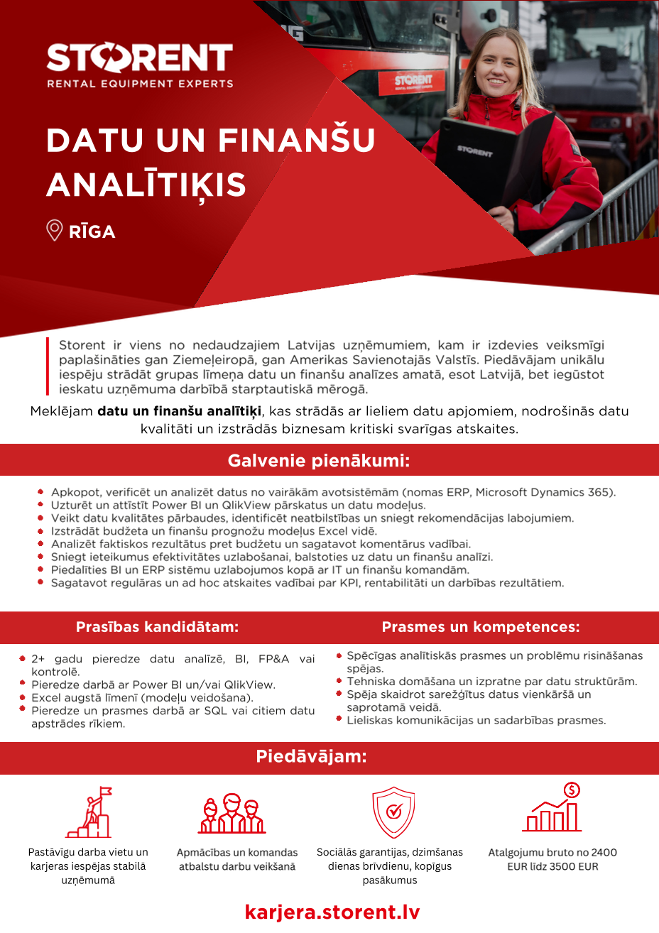 STORENT grupa ir tehnikas nomas uzņēmums, kas ar ievērojamiem panākumiem darbojas Baltijas reģionā, Zviedrijā un Somijā. Zinām, ka stipru komandu veido spēcīgas personības un stabilas uzņēmuma vērtības. Ja darbs lielā, starptautiskā uzņēmumā, kas balstās profesionalitātē, kvalitātē un izcilā klientu servisā, liek Tavām acīm mirdzēt, iespējams, Tava vieta ir mūsu vidū.