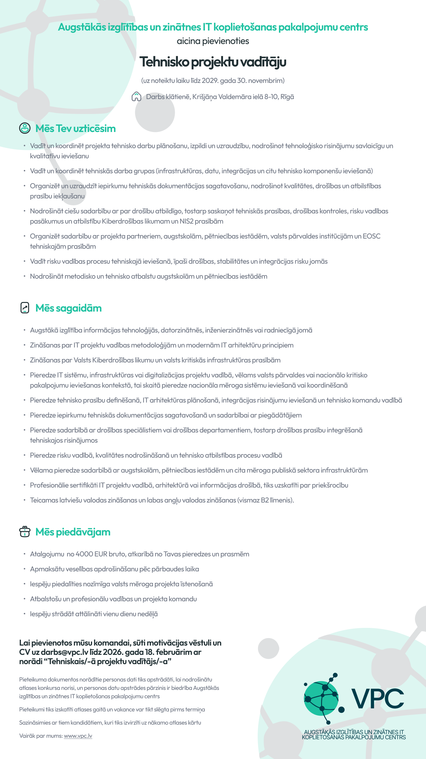 Augstākās izglītības un zinātnes informācijas tehnoloģiju koplietošanas pakalpojumu centru (VPC) izveidoja Latvijas četras lielākās universitātes RTU, RSU, LU un LBTU , lai veicinātu Latvijas izglītības sistēmas digitalizāciju un attīstību. VPC misija ir izmantot šo institūciju un starptautisko pieredzi, lai attīstītu digitālos risinājumus Latvijas augstākās izglītības un zinātnes konkurētspējai. VPC ir dinamiska organizācija, kas darbojas strauji attīstošā un modernā vidē, un, gaida kolēģus, kas vēlas attīstīt savas prasmes mūsdienīgu IT risinājumu ieviešanā Latvijas augstākā izglītībā un zinātnē.