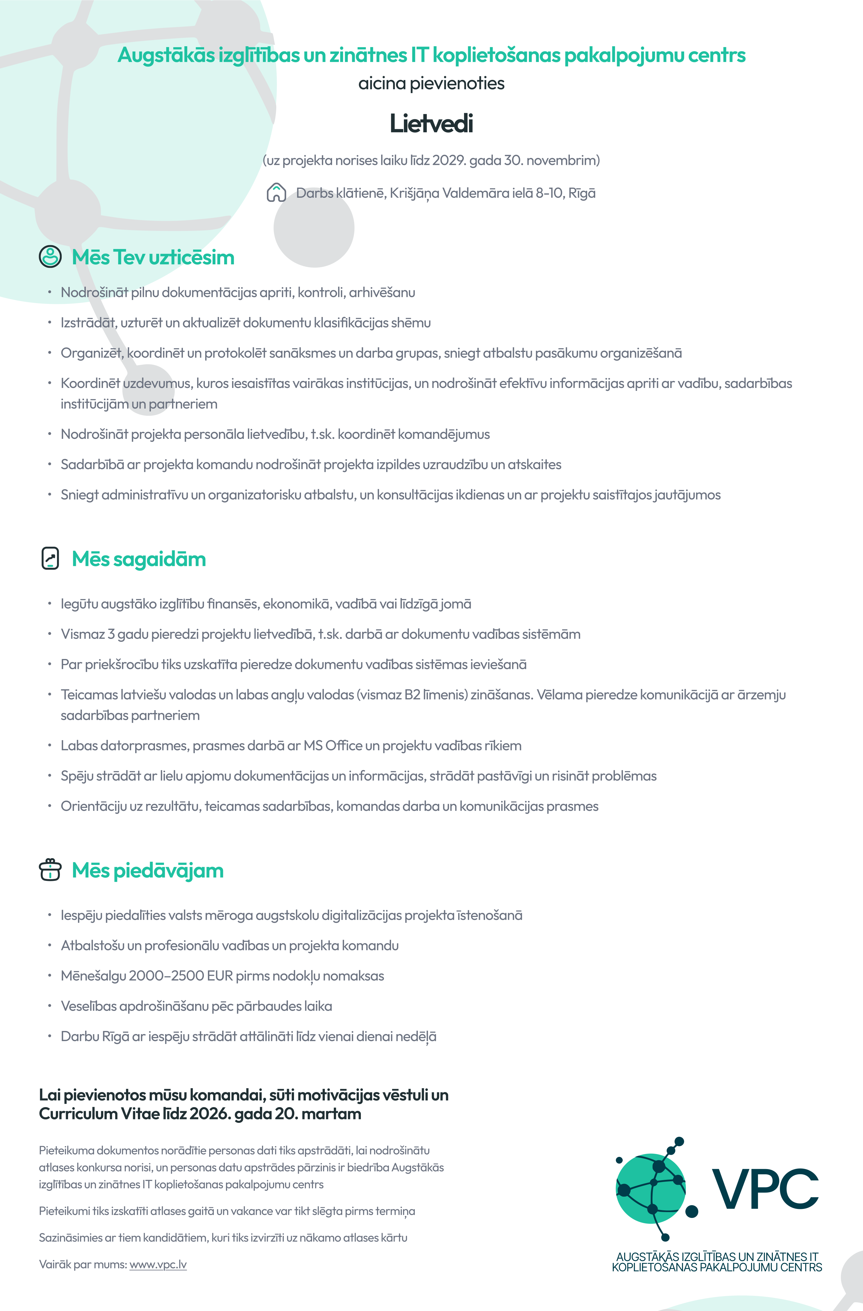 Augstākās izglītības un zinātnes informācijas tehnoloģiju koplietošanas pakalpojumu centru (VPC) izveidoja Latvijas četras lielākās universitātes RTU, RSU, LU un LBTU , lai veicinātu Latvijas izglītības sistēmas digitalizāciju un attīstību. VPC misija ir izmantot šo institūciju un starptautisko pieredzi, lai attīstītu digitālos risinājumus Latvijas augstākās izglītības un zinātnes konkurētspējai. VPC ir dinamiska organizācija, kas darbojas strauji attīstošā un modernā vidē, un, gaida kolēģus, kas vēlas attīstīt savas prasmes mūsdienīgu IT risinājumu ieviešanā Latvijas augstākā izglītībā un zinātnē.