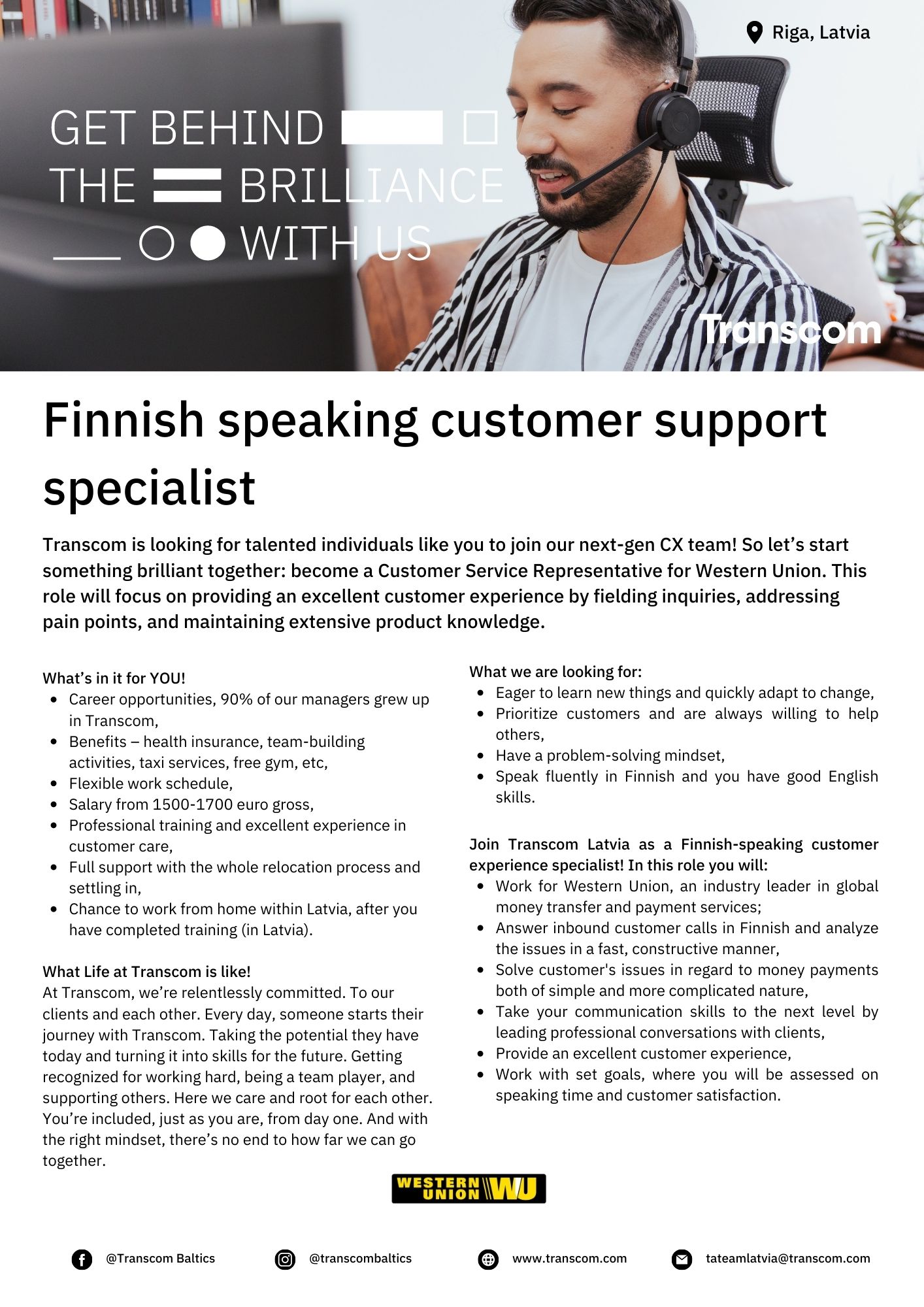 - Answer inbound customer calls in Finnish and analyze the issues in a fast, constructive manner,