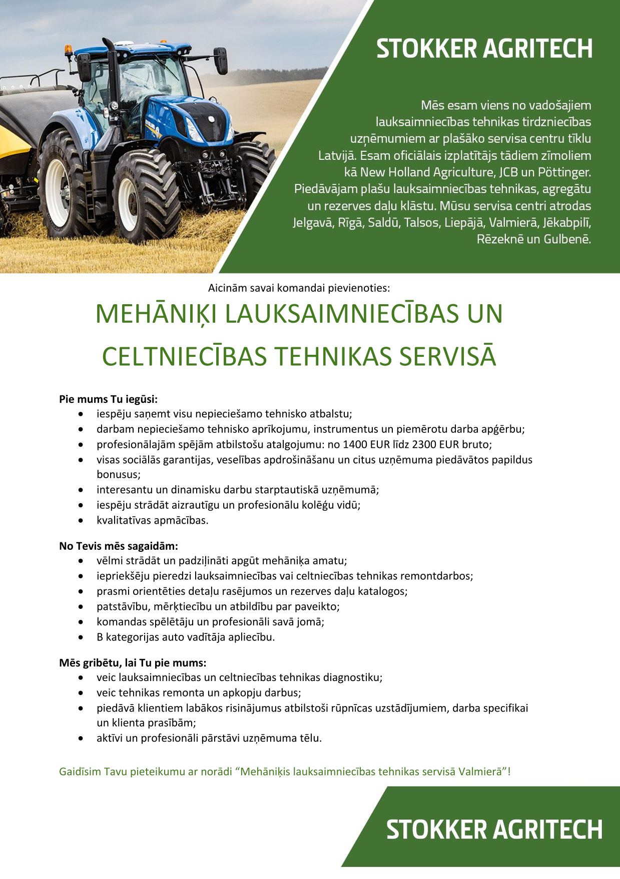 STOKKER AGRITECH ir viens no vadošajiem lauksaimniecības tehnikas tirdzniecības uzņēmumiem ar plašāko servisa centru tīklu Latvijā. Esam oficiālais izplatītājs zīmoliem New Holland Agriculture, Pottinger un JCB. Piedāvājam plašu lauksaimniecības tehnikas, agregātu un rezerves daļu klāstu. Mūsu servisa centri atrodas Jelgavā, Rīgā, Saldū, Talsos, Liepājā, Valmierā, Jēkabpilī, Rēzeknē un Gulbenē.