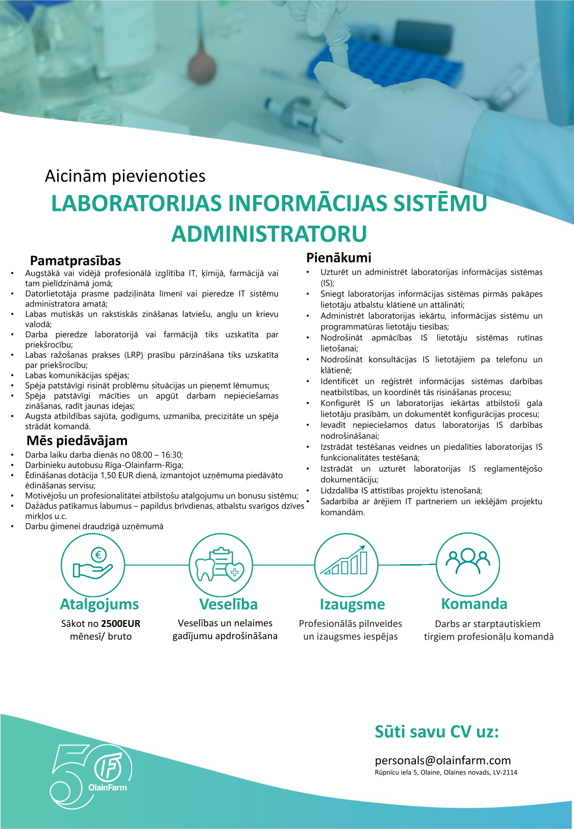 Iesniedzot savu pieteikumu, Jūs dodat piekrišanu akciju sabiedrībai Olainfarm apstrādāt Jūsu iesniegtos personas datus norādītās amata vakances kandidātu izvērtēšanas un atlases procesā. Aicinām pieteikumā neiekļaut sensitīva rakstura informāciju, piemēram, informāciju par veselību. Datus uzglabāsim līdz sešiem mēnešiem pēc pieteikšanās beigu termiņa. Savu personas datu apstrādes piekrišanu Jums ir tiesības atsaukt jebkurā laikā, sazinoties ar pārzini: akciju sabiedrība Olainfarm, reģistrācijas Nr.40003007246, kontaktinformācija datu aizsardzības jautājumos: Rūpnīcu iela 5, Olaine, Olaines novads, Latvija, LV-2114, dataprotection@olainfarm.com, tālruņa Nr.+371 28327856. Papildu informācija par datu apstrādi pieejama www.olainfarm.com Karjera Privātuma atruna.