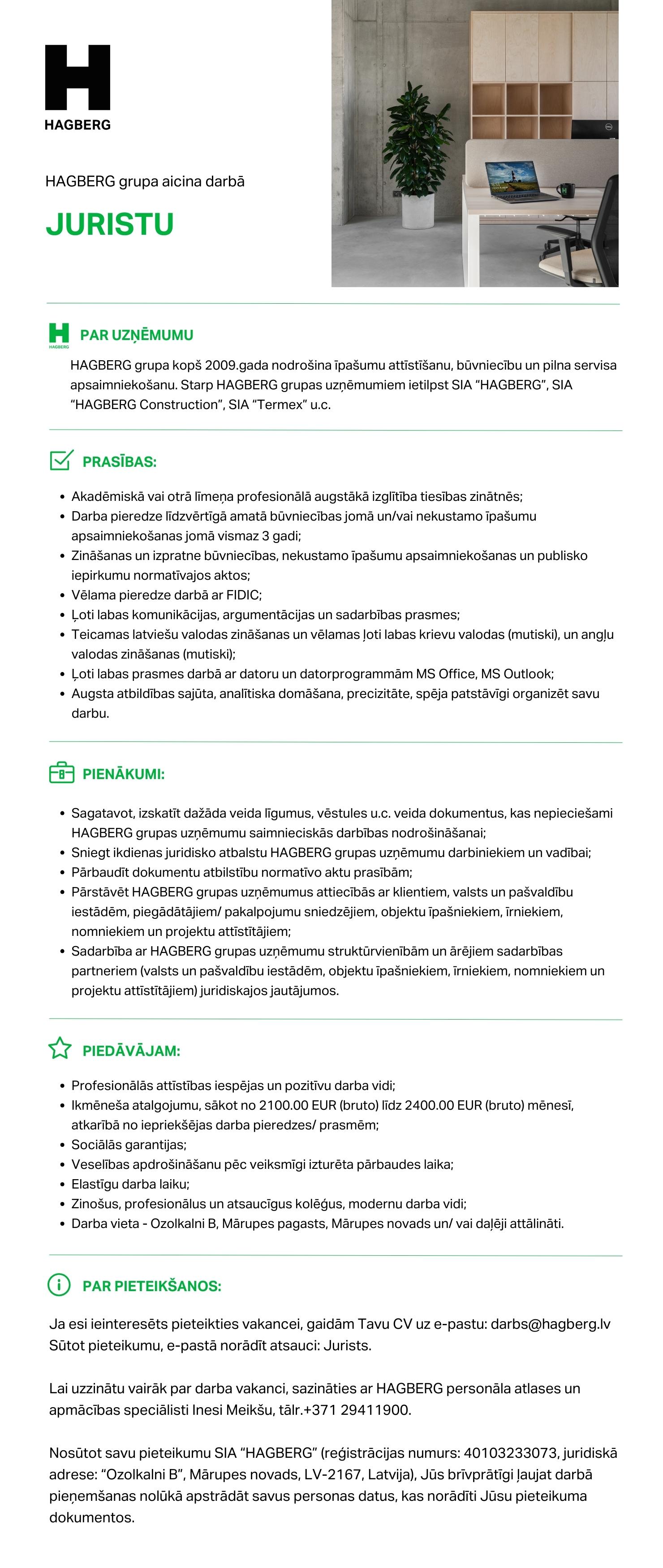 Papildu informācija: Profesionālās attīstības iespējas; motivējoša darba alga un sociālās garantijas; zinoši un atsaucīgi kolēģi, moderna darba vide; veselības apdrošināšanu pēc veiksmīgi izturēta pārbaudes laika; elastīgs darba laiks.