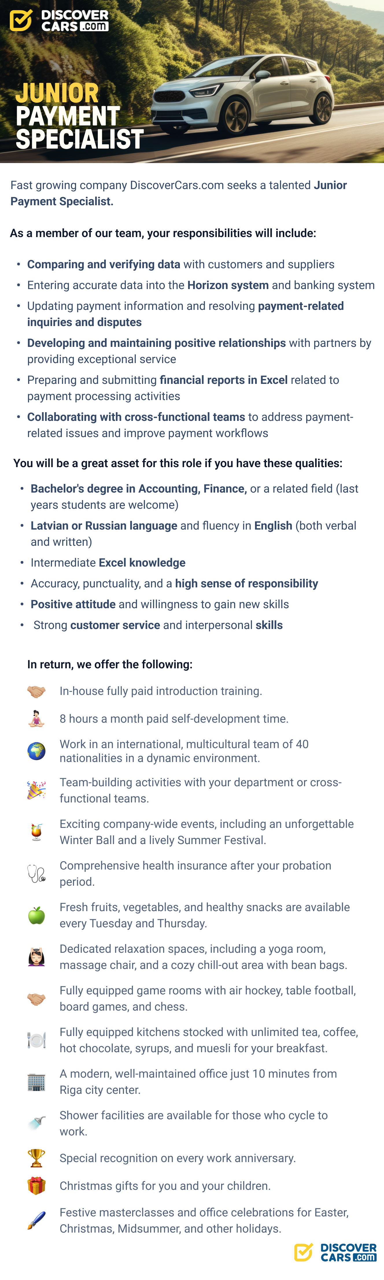 DiscoverCars.com, one of the fastest-growing companies in Europe, according to the Financial Times, seeks to be a world leader in online car rental reservations. Serving more than 10k locations in 145 countries, our company is constantly adding new partners in new locations and pushing for the best prices and service for our customers.We currently serve more than 2.5 million customers monthly via our website, which is available in 20 languages while providing the best possible 24/7 customer support.Our success stems from the fantastic international team we have put together, comprising more than 200 teammates of diverse backgrounds representing 40 nationalities. Each of our employees is a professional in their field and is given the autonomy to do their job as they see best and all the necessary support.