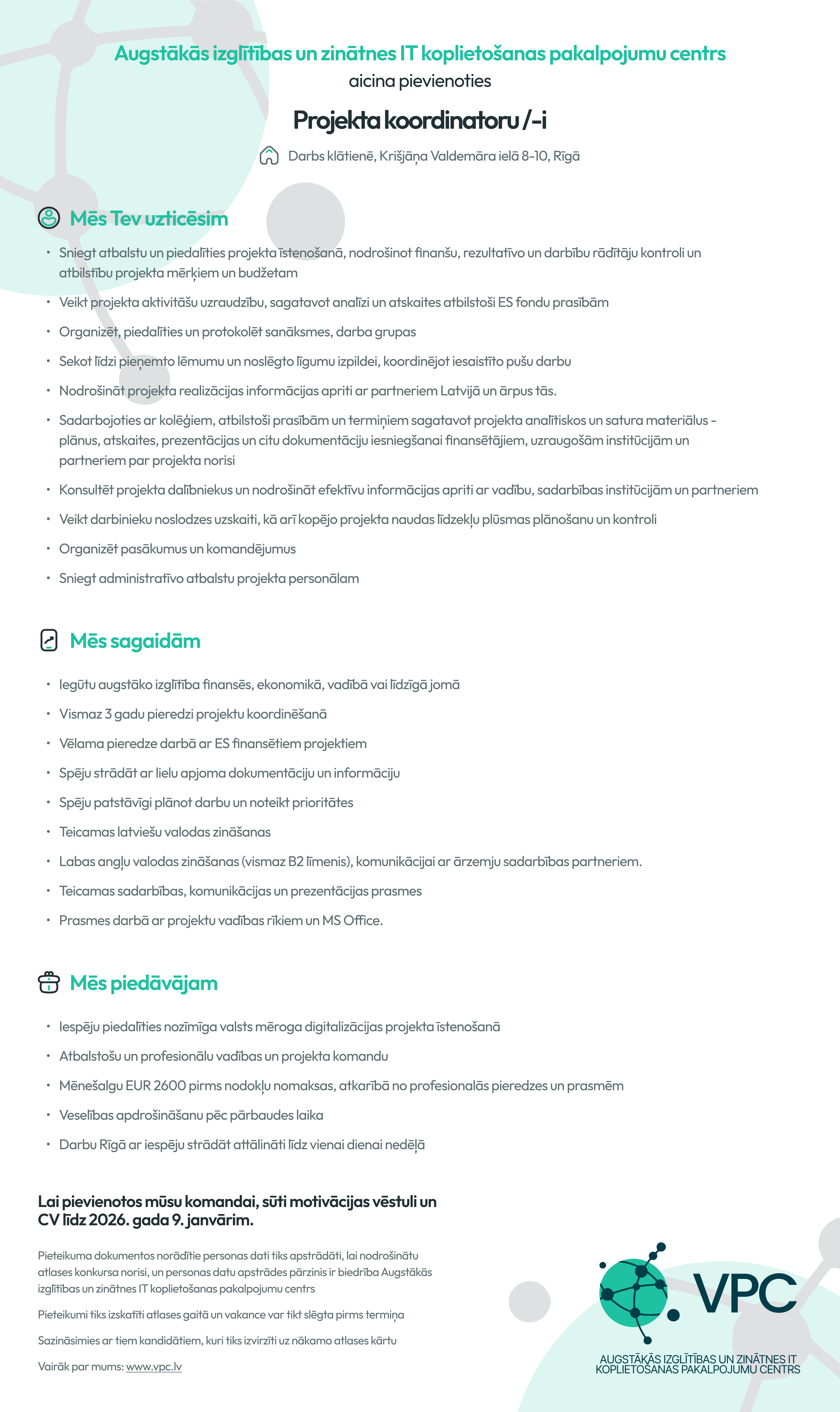 Augstākās izglītības un zinātnes informācijas tehnoloģiju koplietošanas pakalpojumu centru (VPC) izveidoja Latvijas četras lielākās universitātes RTU, RSU, LU un LBTU , lai veicinātu Latvijas izglītības sistēmas digitalizāciju un attīstību. VPC misija ir izmantot šo institūciju un starptautisko pieredzi, lai attīstītu digitālos risinājumus Latvijas augstākās izglītības un zinātnes konkurētspējai. VPC ir dinamiska organizācija, kas darbojas strauji attīstošā un modernā vidē, un, gaida kolēģus, kas vēlas attīstīt savas prasmes mūsdienīgu IT risinājumu ieviešanā Latvijas augstākā izglītībā un zinātnē.