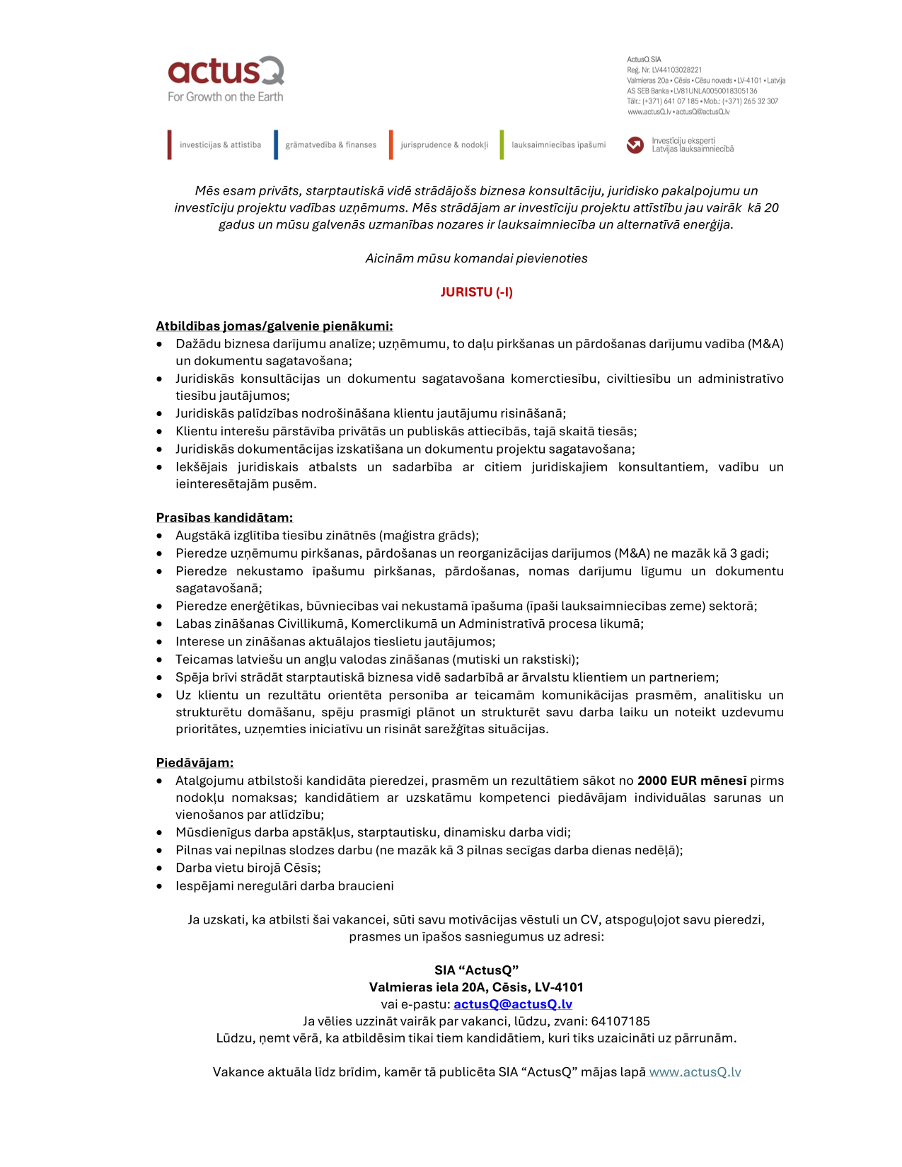 ActusQ ir biznesa konsultāciju uzņēmums, kas piedāvā plašu pakalpojumu spektru galvenokārt skandināvu kapitāla lauksaimniecības uzņēmumiem. Mūsu pamatdarbības virzieni ir biznesa un juridiskās konsultācijas un pakalpojumi par dažādiem uzņēmējdarbības jautājumiem, projektu izstrāde un vadība, kā arī grāmatvedības un administrācijas pakalpojumi saviem klientiem. Mēs esam dinamisks konsultāciju uzņēmums ar vēlmi un spēju radīt pievienoto vērtību savu klientu interesēs.