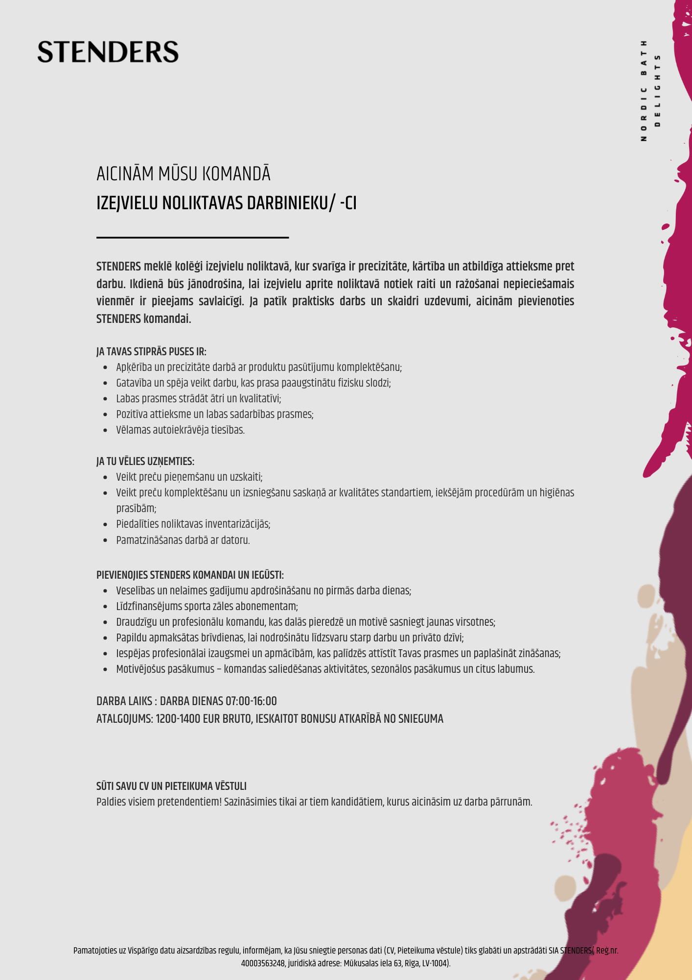 - Veikt preču komplektēšanu un izsniegšanu saskaņā ar kvalitātes standartiem, iekšējām procedūrām un higiēnas prasībām;