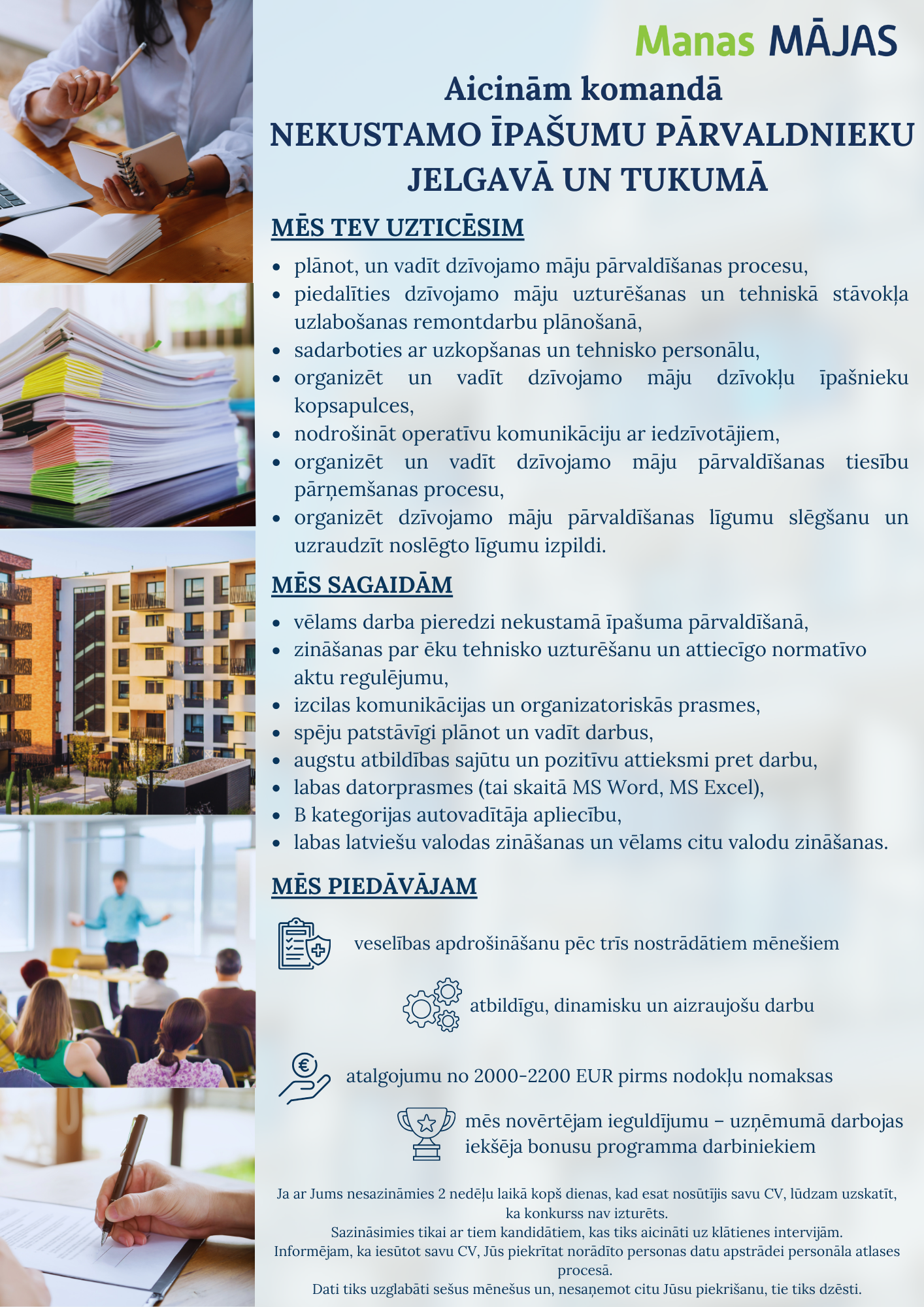 Manas MĀJAS nodrošina īpašuma pārvaldību. Kā strauji augoša uzņēmumu grupa, mēs palīdzam saviem klientiem radīt harmonisku dzīves un darba vidi, sniedzot pakalpojumus, kas rada pievienoto vērtību. Mūsu pakalpojumi ietver ēku apsaimniekošanu, inženiertehniskos risinājumus un uzkopšanu.Mēs rūpējamies par dzīves un darba vidi. Mēs strādājam, lai padarītu mūsu klientu vidi ērtāku, sakoptāku un drošāku. Izmantojot pareizos rīkus, pieredzi un vairāk nekā 150 cilvēku lielu palīdzību, mēs esam gatavi turpināt izaugsmi.