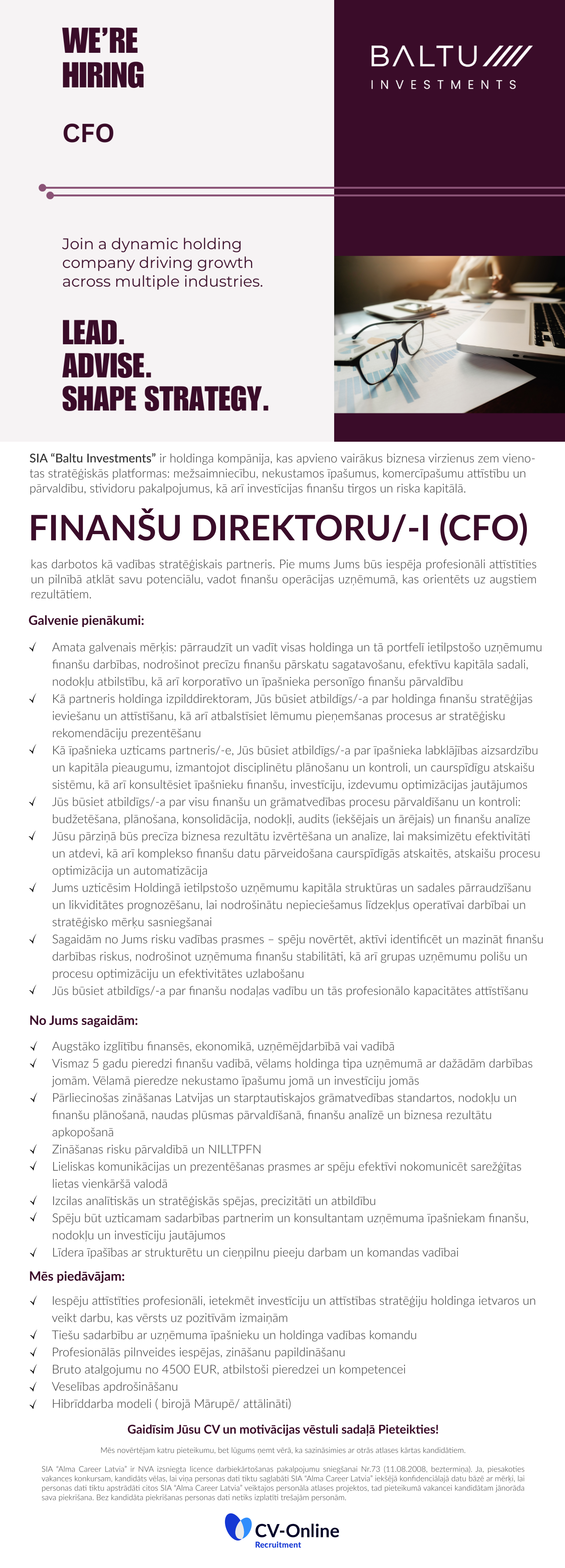 Papildu informācija: atalgojums no 4500 EUR atbilstoši pieredzei un kompetencei, veselības apdrošināšana, hibrīddarba modelis (birojā Mārupē/attālināti).