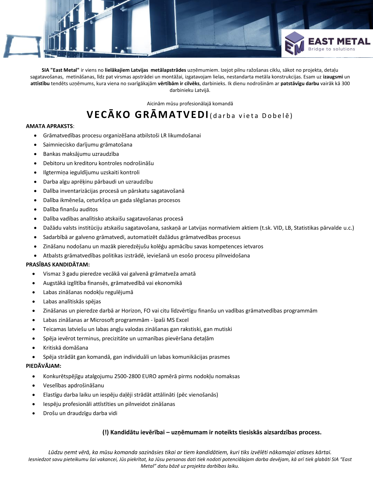 SIA "East Metal" ir starptautisks metālapstrādes uzņēmums, viens no lielākajiem metālapstrādes uzņēmumiem Latvijā. Izejot pilnu ražošanas ciklu, sākot no projekta, detaļu sagatavošanas, metināšanas, līdz pat virsmas apstrādei un montāžai, izgatavojam lielas, nestandarta metāla konstrukcijas. Esam uz izaugsmi un attīstību tendēts uzņēmums, kura viena no svarīgākajām vērtībām ir cilvēks, darbinieks. Viens no mūsu vadmotīviem drošība pirmajā vietā! Tāpēc mūsu darbinieki tiek nodrošināti ar pilnīgi visiem darba aizsardzības līdzekļiem un darbiniekiem piedāvājam augstas klases veselības apdrošināšanu. Esam viens no lielākajiem darba devējiem reģionā un lielākais darbspēka nodokļu maksātājs Zemgalē, ik dienu nodrošinot ar pastāvīgu darbu vairāk kā 350 darbinieku Zemgalē, kopā Latvijā tie ir vairāk kā 650 darbinieki. Tāpat, domājot par vidi un nākotni, esam zaļi domājošs uzņēmums, ko apliecina 2019. gadā saņemtā Zaļās izcilības balva. Viens no pēdējiem sasniegumiem ir VID Padziļinātās sadarbības programmas Zelta līmeņa dalībnieka statusa iegūšana.