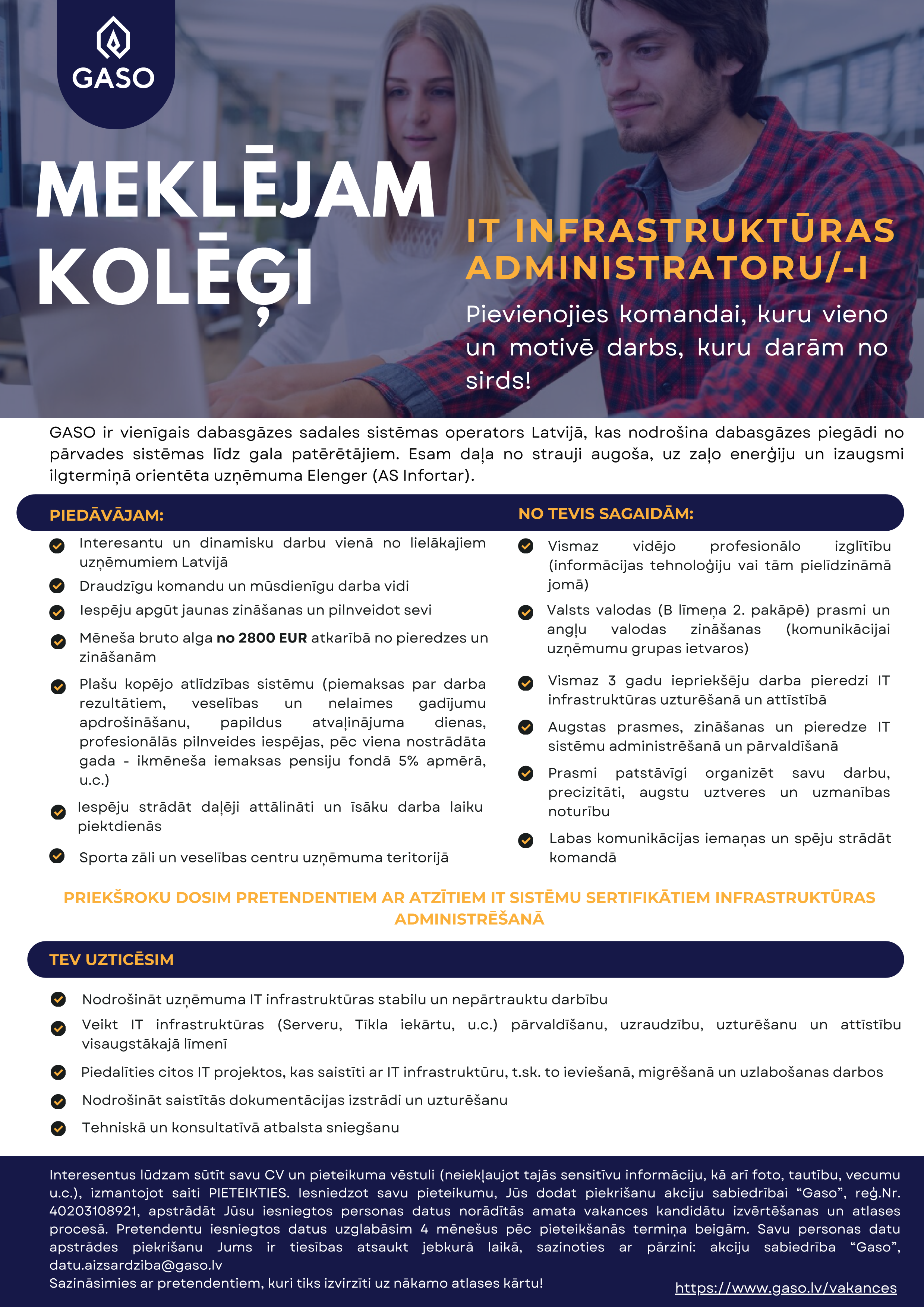 Papildu informācija: Darba alga sākot no 2800 EUR/mēnesī, piemaksas par darba rezultātiem, veselības un nelaimes gadījumu apdrošināšana, iemaksas pensiju fondā darbinieka labā