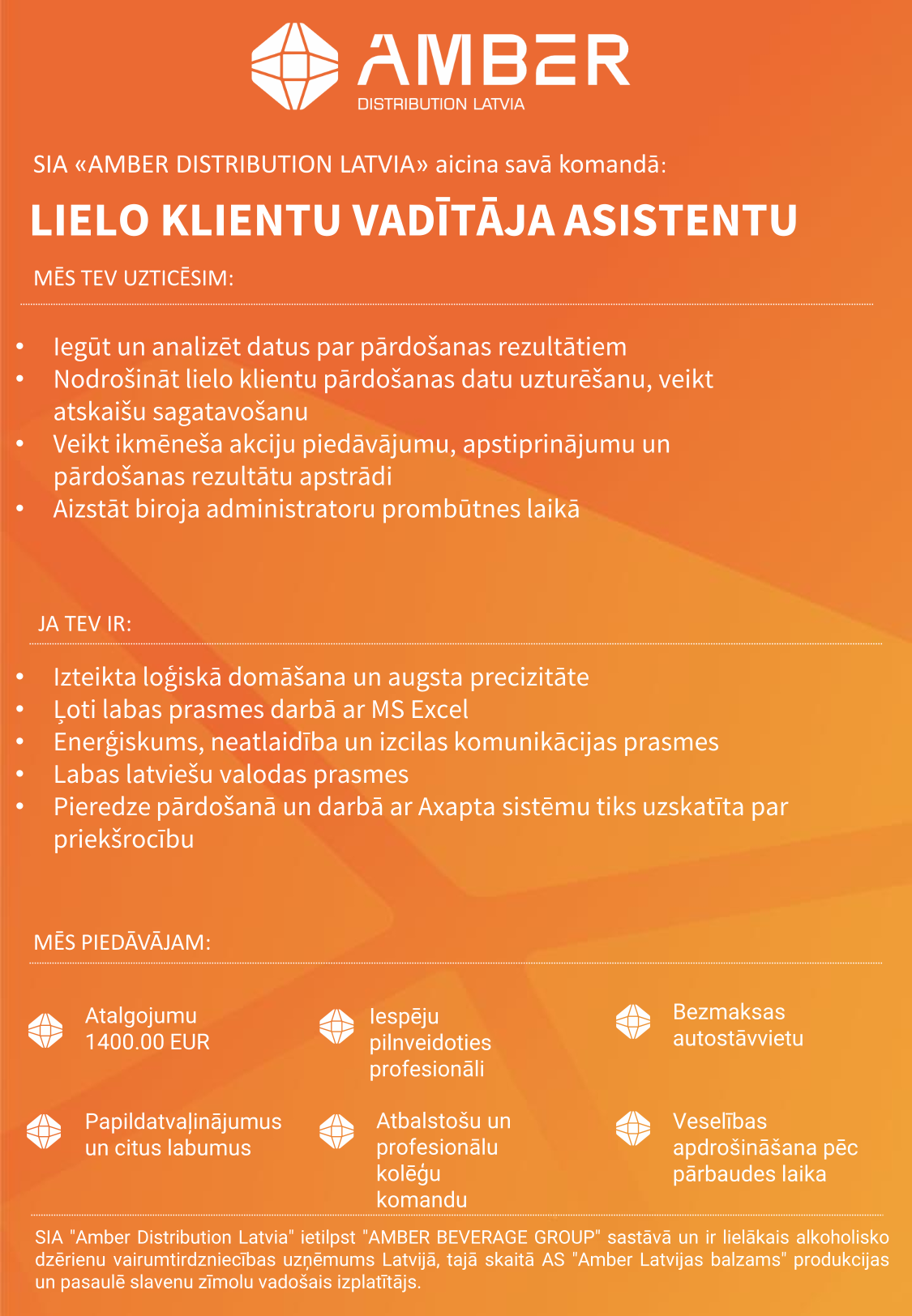 SIA Amber Distribution Latvia" ietilpst "AMBER BEVERAGE GROUP" sastāvā un ir lielākais alkoholisko dzērienu vairumtirdzniecības uzņēmums Latvijā, tajā skaitā AS Amber Latvijas balzams" produkcijas un pasaulē slavenu zīmolu vadošais izplatītājs.