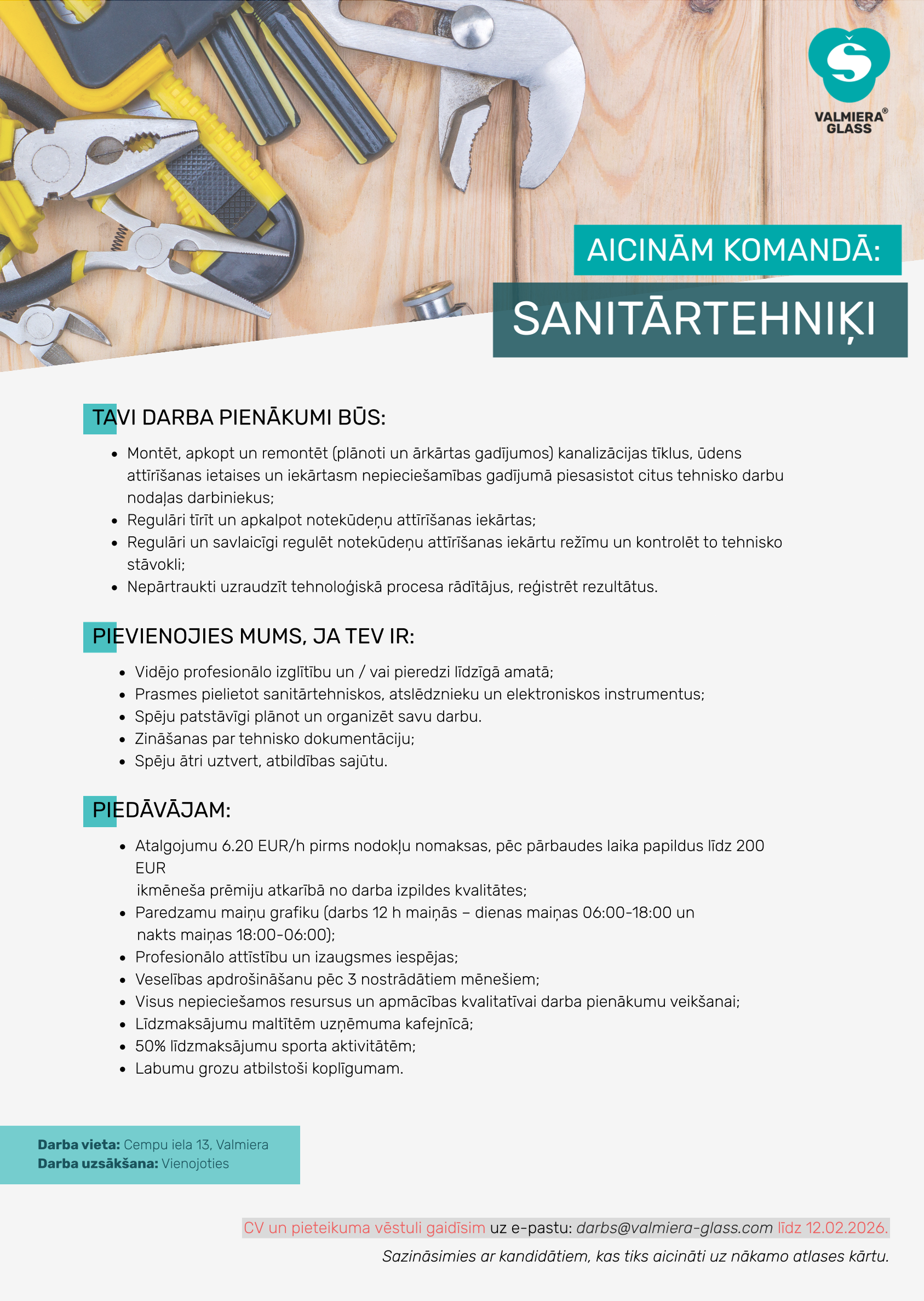 Papildu informācija: Pēc pārbaudes laika papildus ikmēneša prēmija 200 EUR pirms nodokļu nomaksas, darbs maiņās ar grafiku, kas zināms visam gadam uz priekšu.