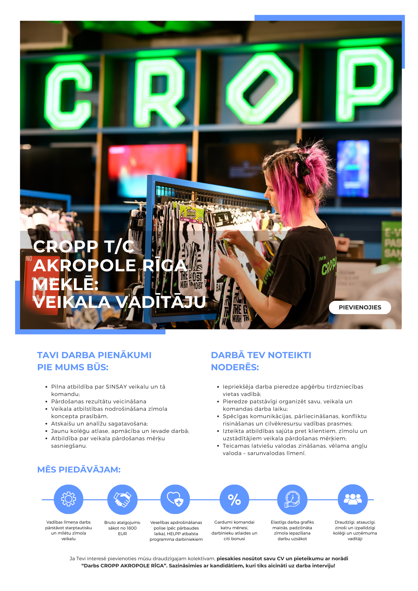CROPP ir ielas apģērbu zīmols, kas labi iekļaujas pilsētas telpā un dzīvesveidā. Zīmols ir paredzēts jaunajiem pilsētas trokšņa cēlējiem, zēniem un meitenēm, kuri dzīvo saskaņā ar saviem noteikumiem un kuriem patīk tādas drēbes, kas izsaka viņu personību. Cropp kolekcijas iespaidojas no pop un hip-hop kultūras un smeļas iedvesmu no grafiti, ielu mākslas, pilsētvides sporta un mūzikas. Šodien ikviens var iegādāties CROPP jauniešu ielas modes apģērbus, apavus un aksesuārus vairāk kā 380 veikalos Centrālajā, Austrumu un Dienvideiropā, kā arī NVS valstīs, tostarp 5 CROPP veikalos Rīgā un tiešsaistē: www.cropp.com/lv