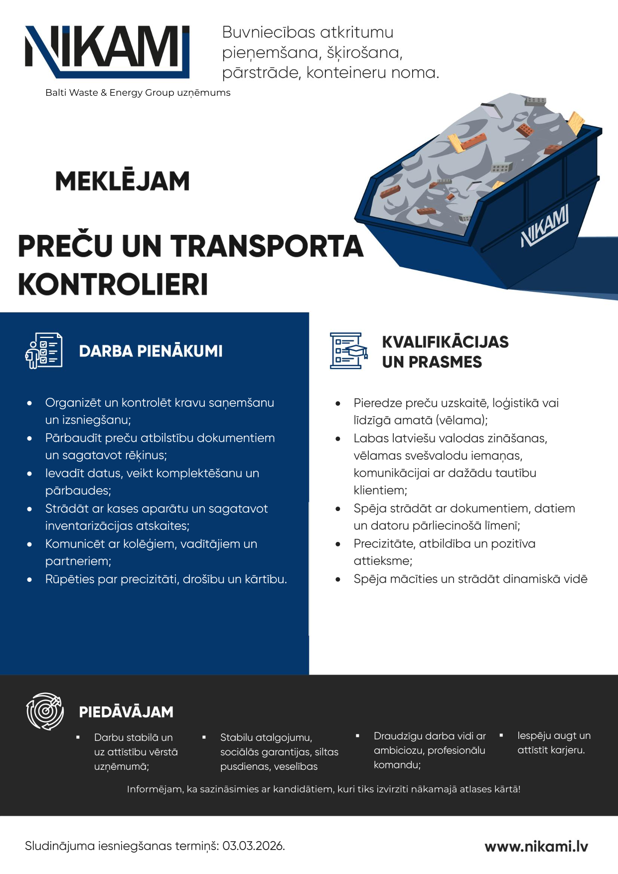 NIKA MI ir pakalpojumu sniedzējs Rīgā un Rīgas rajonā, kas specializējas atkritumu savākšanā, būvgružu pārstrādē un šķirošanā, koksnes materiālu šķeldošanā, kā arī beramkravu piegādē un sniega izvešanā.