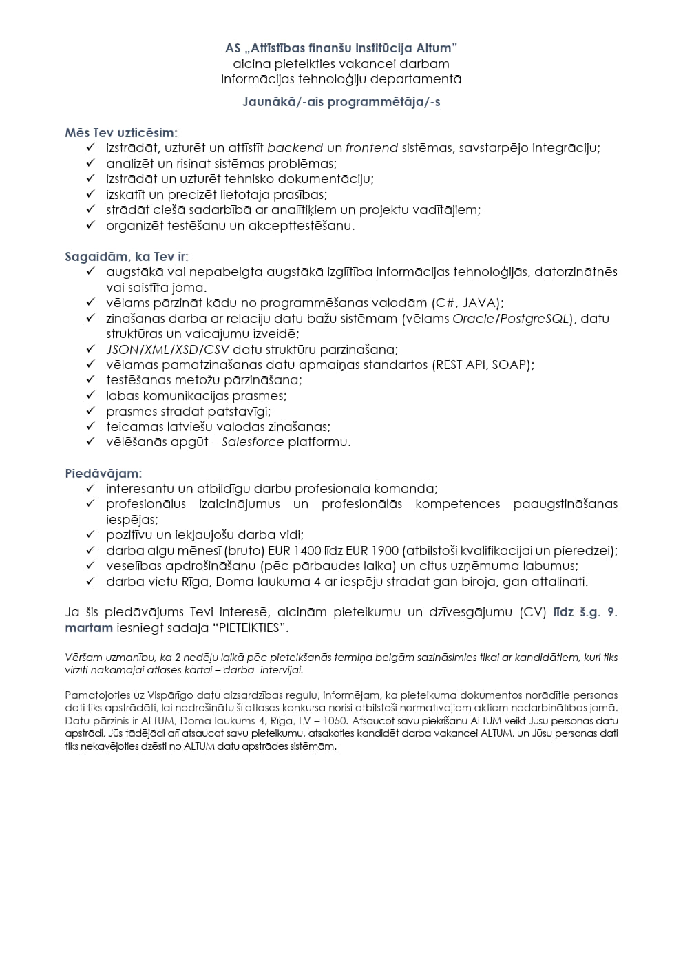 Papildu informācija: Darba alga mēnesī (bruto) EUR 1400 līdz EUR 1900 (atbilstoši kvalifikācijai un pieredzei);