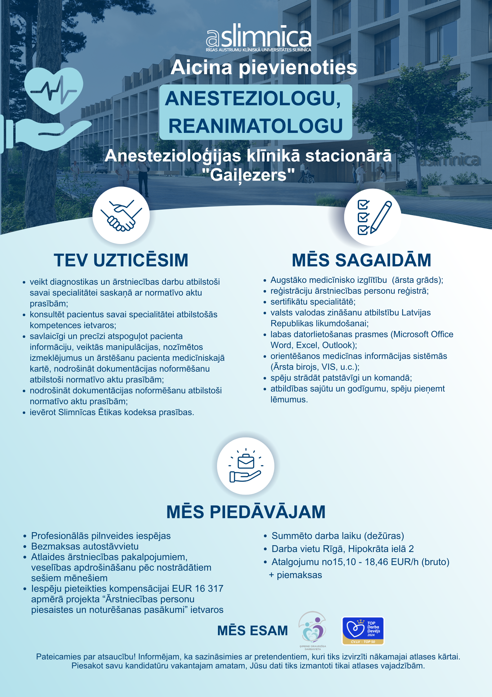 Aicinām pievienoties mūsu profesionāļu komandai, izvēloties sev atbilstošu vakanci kādā no slimnīcas stacionāriem un Jūs iegūsiet darbu vienā no Latvijas lielākajiem un stabilākajiem uzņēmumiem.
