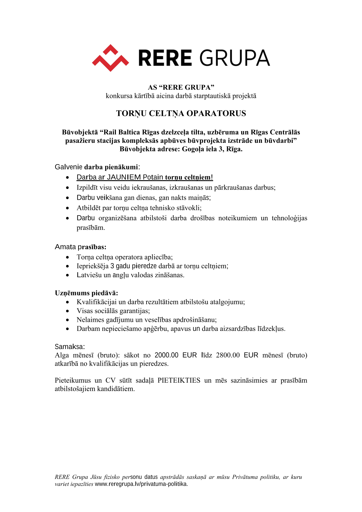 Papildu informācija: Alga mēnesī (bruto): sākot no 2000.00 EUR līdz 2800.00 EUR mēnesī (bruto) atkarībā no kvalifikācijas un pieredzes.