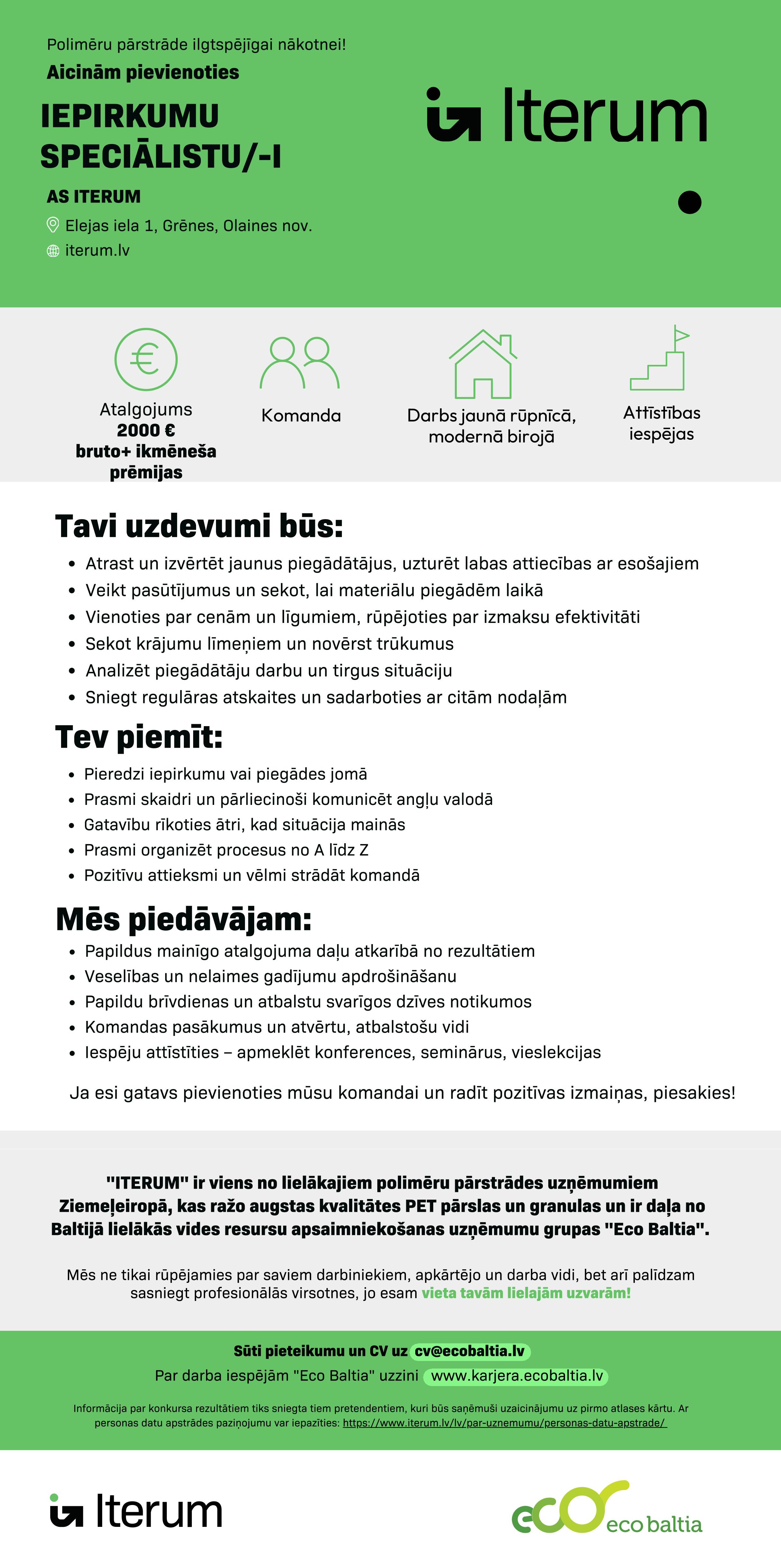AS "ITERUM" ir Baltijā vadošā polietilēnteraftalāta (PET) pārstrādes rūpnīca un viens no lielākajiem PET pārstrādes uzņēmumiem Ziemeļeiropā, vienuviet koncentrējot nozares kompetenci, tehnoloģijas un uz attīstību vērstu pieeju. Mūsu specialitāte ir augstas kvalitātes PET pārslas un granulas, kas veicina cirkulāru resursu izmantošanu un vides ilgtspēju. Pastāvīgi ieguldām rūpnīcas un tehnoloģiju attīstībā, lai palielinātu ražošanas jaudu un izstrādātu jaunus un augstvērtīgus produktus. Mūsu misija ir padarīt vides labklājību un resursu atkārtotu izmantošanu par galveno prioritāti ikvienam.