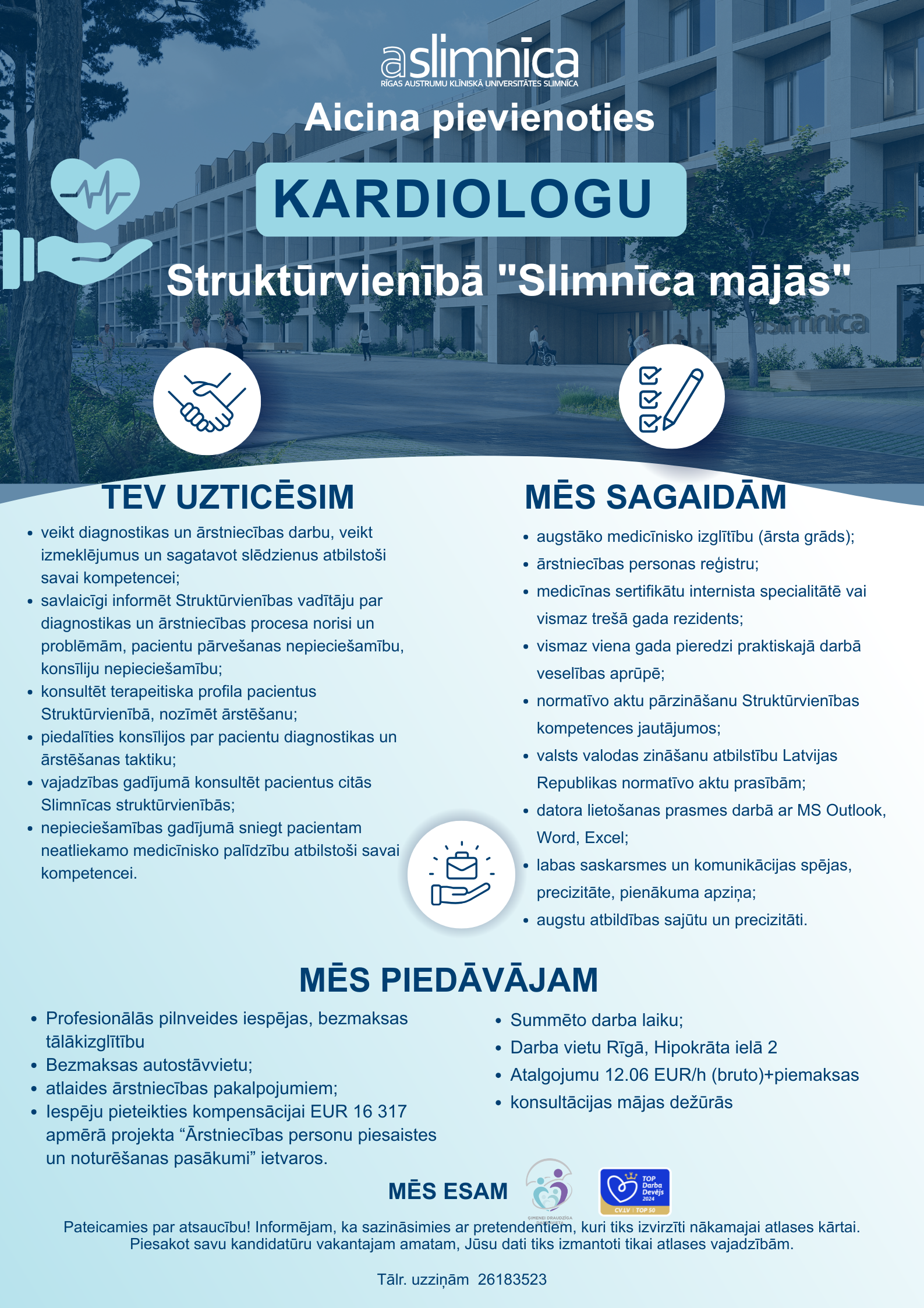 Aicinām pievienoties mūsu profesionāļu komandai, izvēloties sev atbilstošu vakanci kādā no slimnīcas stacionāriem un Jūs iegūsiet darbu vienā no Latvijas lielākajiem un stabilākajiem uzņēmumiem.
